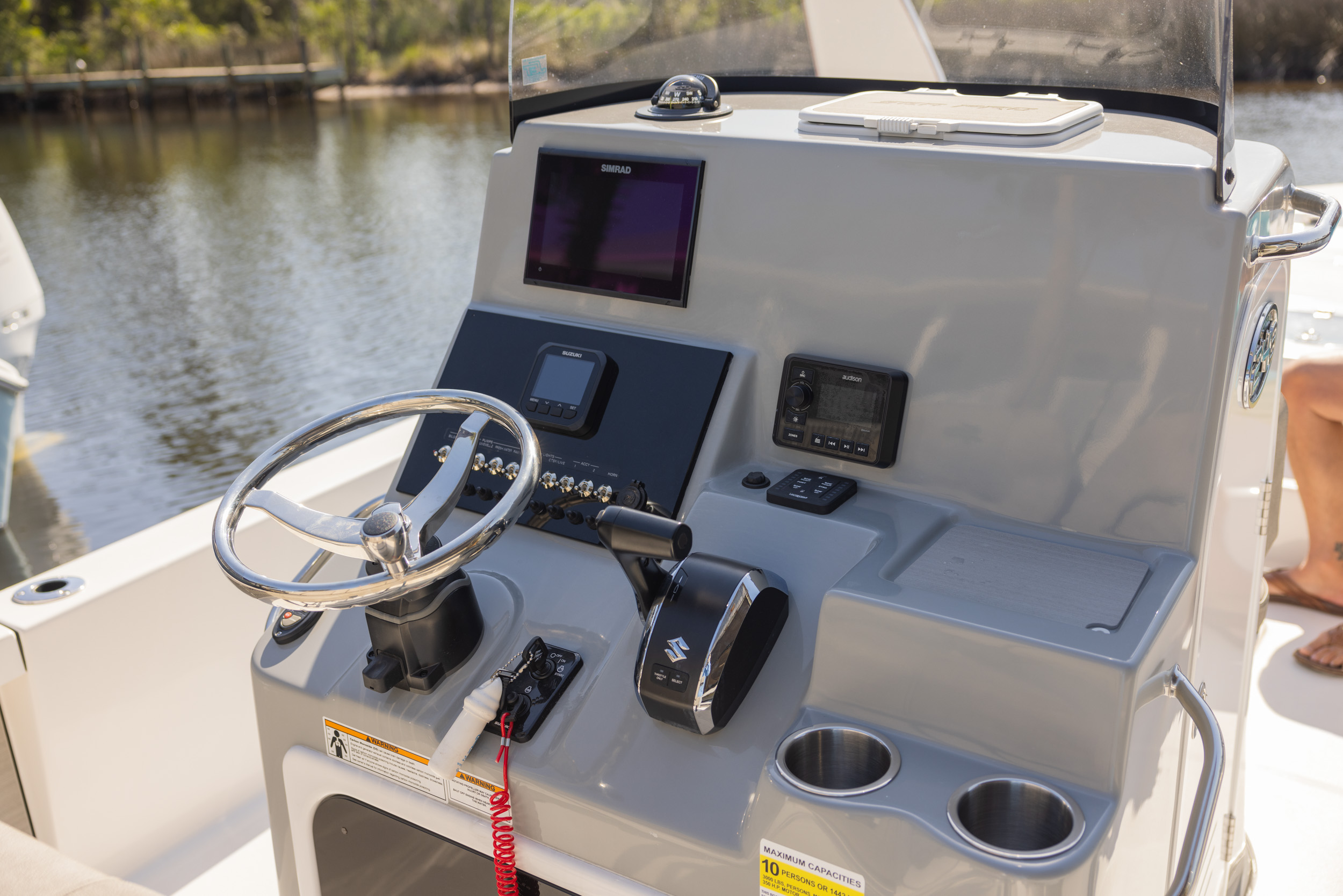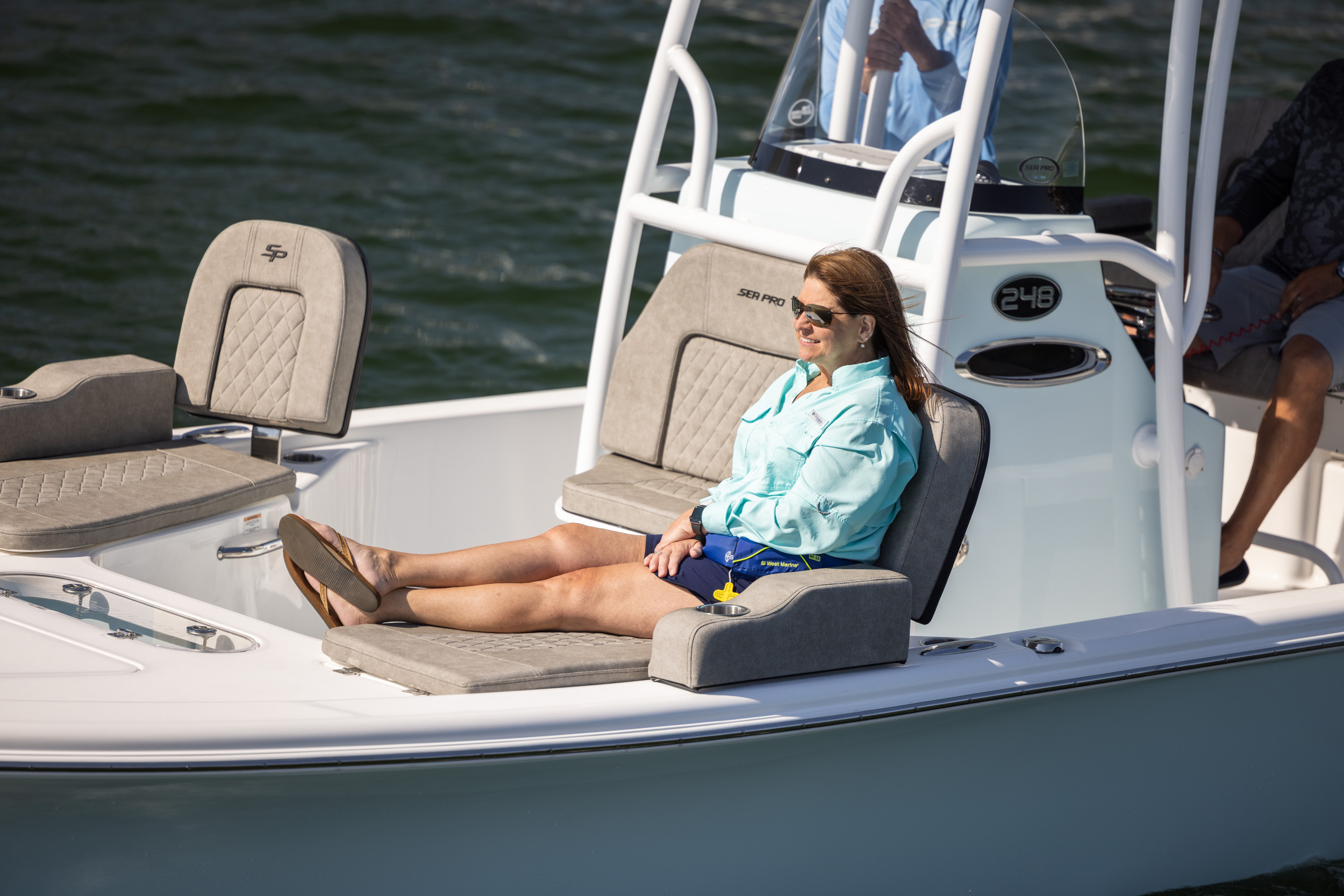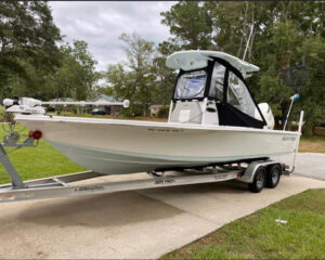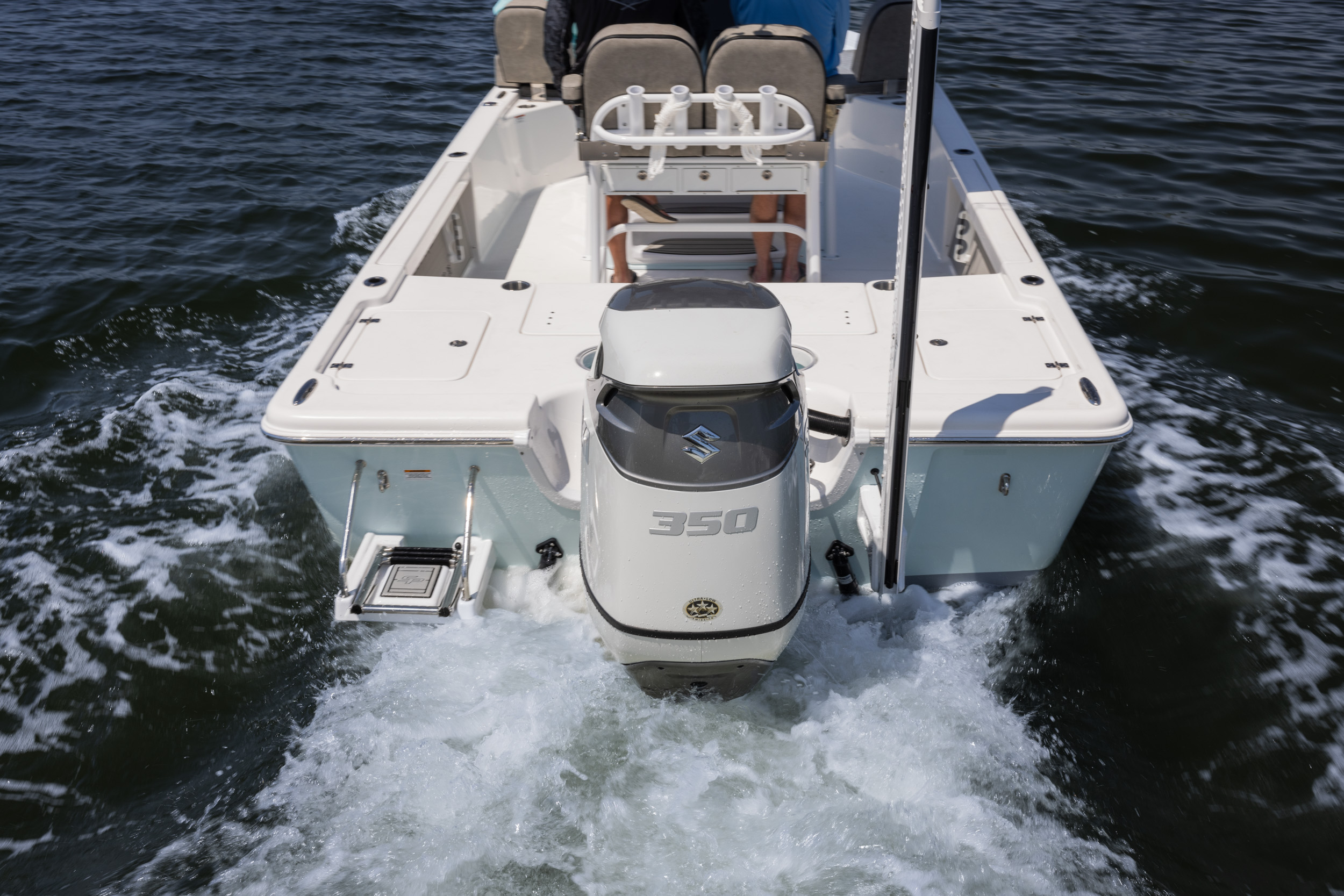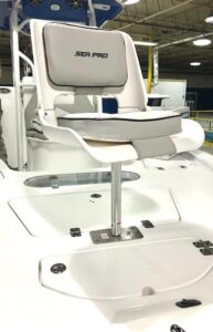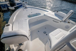 The 230 Bay offers a forward deck step with 5 gallon bucket storage along with more room in both the front and rear of the deck than it’s 210 sibling.